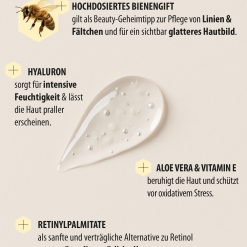 Laut Studien kann Bienengift die körpereigene Kollagen- und Elastinbildung anregen. Das unterstützt eine festere Anmutung der Haut und lässt feine Linien und Fältchen optisch gemildert erscheinen. Ideal für strahlend glatte Haut.