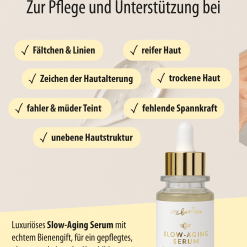 Das Slow-Aging Serum bringt Bienengift, Hyaluron und Aloe Vera in konzentrierter Form direkt auf die Haut und versorgen sie intensiv mit Feuchtigkeit. Die federleichte Textur zieht schnell ein und bereitet die Haut optimal vor.