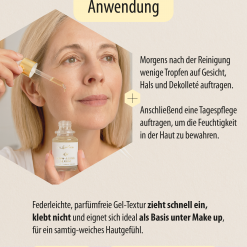 Morgens nach der Reinigung wenige Tropfen des Serums auf Gesicht, Hals und Dekolleté auftragen.