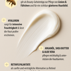 Die geschmeidige, dennoch leichte Creme-Textur mit dezentem Duft, zieht zügig ein ohne zu fetten. Arganöl und Sheabutter pflegen intensiv, Hyaluron bindet Feuchtigkeit. Die Haut fühlt sich glatt, weich und gut versorgt an und eignet sich ideal als Basispflege unter Make-up.