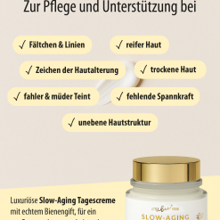 Die Slow-Aging Tagescreme pflegt mit Bienengift, Hyaluron und kostbarem Arganöl. Sie schenkt ein geschmeidiges und genährtes Hautgefühl und rundet die Pflege luxuriös ab.