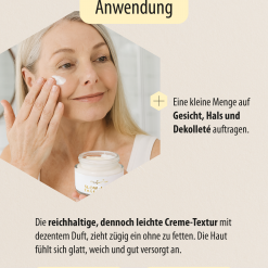 Für alle Hauttypen geeignet, besonders geeignet für reife, trockene, müde oder fahle Haut, die zu Trockenheitsfältchen neigt und umfassende Pflege sowie Geschmeidigkeit wünscht.