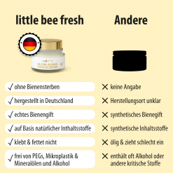 - Bienengift (Melittin), unser Highlight-Wirkstoff: laut Studien fördert es die Kollagenproduktion, unterstützt die Hautfestigkeit und kann die Haut sichtbar glatter erscheinen lassen. Feine Linien und Fältchen wirken optisch gemildert.