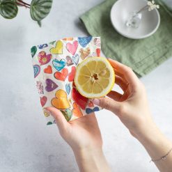 Stefanies Lieblingsthema schmückt nun unsere gemeinsame Kollektion an Bio-Bienenwachstüchern. Herausgekommen ist ein einzigartiges limitiertes Design mit vielen bunten Herzen: Eine besonders schöne Geschenk-Idee zum Muttertag und für alle anderen Geschenke, die von Herzen kommen.