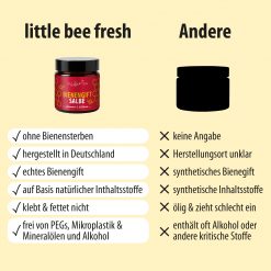 Unsere Bienengiftsalbe wird in kleinen Chargen unter hohen Hygienestandards in Deutschland hergestellt und in hochwertigen Braunglastiegeln abgefüllt. Frei von Parabenen, Silikonen und Mineralölen. Ein echtes Naturprodukt – für dich, deine Familie und deine Hausapotheke.