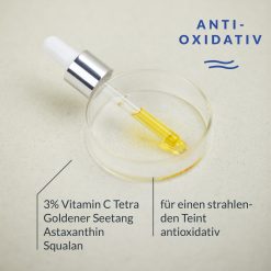 Wusstest du, dass VItamin C in Kosmetikprodukten oft sehr instabil ist und schnell an Wirkung verliert, da es oxidiert? Darum haben wir uns für Vitamin C Tetra, eine neue äußerst stabile, sanfte und trotzdem hochwirksame Form von Vitamin C in der laut Studien sinnvollsten Einsatzkonzentration entschieden. Es ist außerdem öllöslich, darum haben wir das Vitamin Sea Serum als leichtes Öl formuliert. Das öllösliche Vitamin C Tetra kann im Vergleich zu anderen Vitamin C Formen übrigens besonders tief in die Haut eindringen und dort seine Wirkung entfalten.